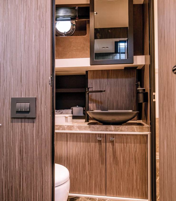 L’impianto idraulico impiega tubazioni multistrato e raccordi a innesto rapido ispezionabili; l’acqua calda è servita da boiler con scambiatori dedicati e resistenza elettrica. Il condizionamento, dimensionato per climi caldi mediterranei, ha canalizzazioni studiate per limitare rumorosità e stratificazione termica. Sul fronte sicurezza: impianto antincendio certificato in sala macchine, monitor gas, pompe di sentina ridondate e piano di evacuazione con uscite identificate.