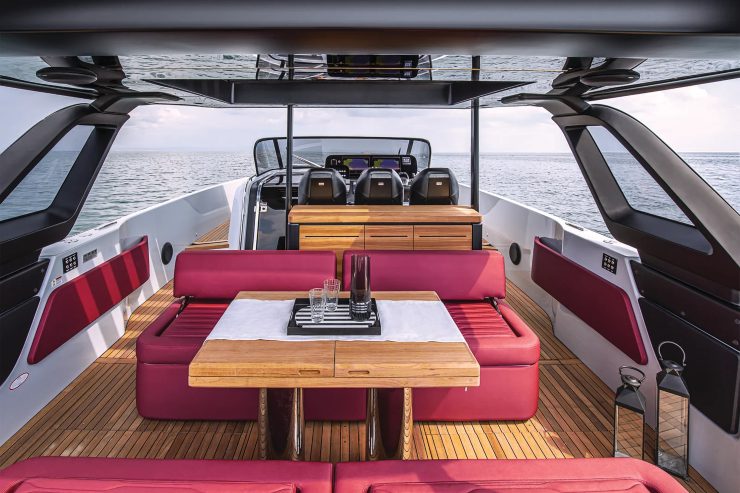 L’estetica è affidata a un linguaggio tensionato e muscolare ma mai aggressivo: parabrezza avvolgente, fiancate scolpite, sovrastruttura leggera e un sapiente gioco di spigoli che alleggeriscono i volumi. È un design che serve la funzione: i passavanti ampi non costringono, le murate proteggono senza chiudere la vista, e le aree prendisole si integrano con i flussi di bordo. La falchetta abbattibile trasforma il pozzetto in una terrazza sul mare, ampliando la superficie utile senza alterare l’equilibrio del baricentro.