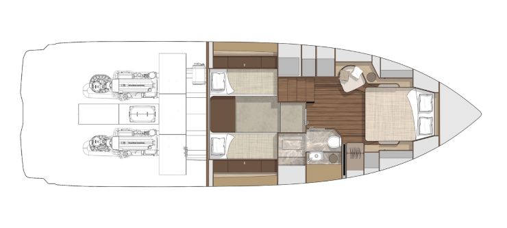 Il progetto nasce intorno alla piattaforma Volvo Penta IPS con doppia motorizzazione, tipicamente nella configurazione IPS 650. La trasmissione a pod con eliche traenti, orientabili, consente di trasformare una quota maggiore della potenza disponibile in spinta utile, riducendo scia e resistenza residua. In ambito operativo questo si traduce in consumi più contenuti a pari velocità, rumorosità inferiore e raggio di evoluzione ridotto nelle manovre.