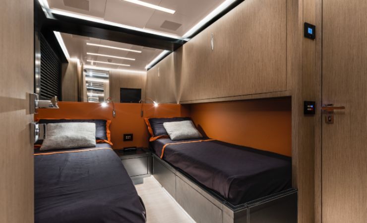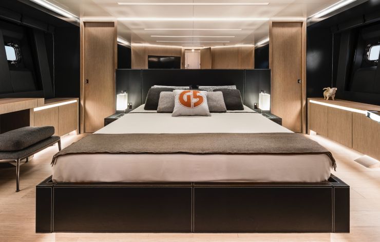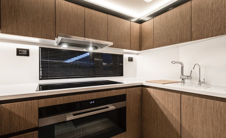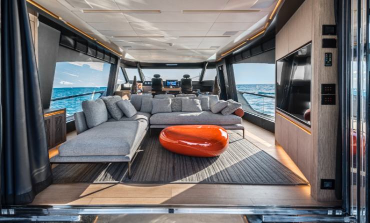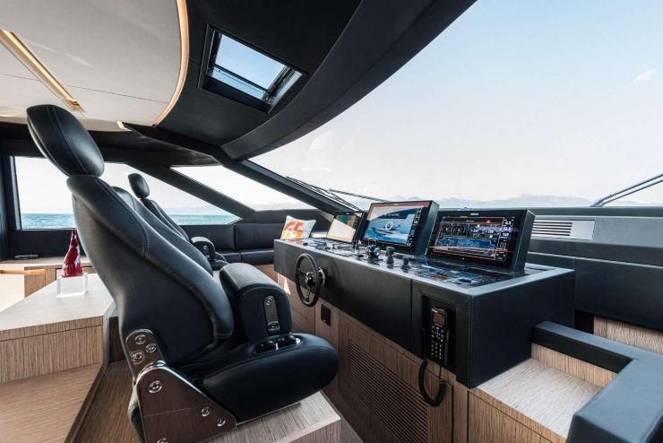 Sottocoperta, il layout tipico prevede cabina armatoriale full-beam, VIP a prua e due doppie/twin, per un totale fino a 8–9 ospiti a seconda della configurazione, oltre alla cabina equipaggio (2 posti). La cucina può essere sul ponte principale (scelta apprezzata dal mercato USA) in soluzione “aperta” verso la dinette, oppure al ponte inferiore in configurazione più europea. L’ergonomia della zona di pilotaggio – postura, accesso ai comandi dei waterjet e visibilità a 360° – è studiata per ridurre affaticamento e tempi di reazione alle alte andature.