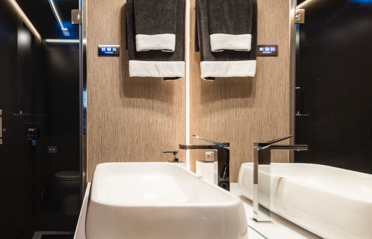 La filosofia “performance without compromise” del cantiere si riflette in ogni dettaglio, dalla ferramenta custom al layout impiantistico ordinato: percorsi di servizio lineari, accessi manutentivi ampi e separati, ventilazione sala macchine con flussi ottimizzati e instradamento cablaggi su canaline ispezionabili.