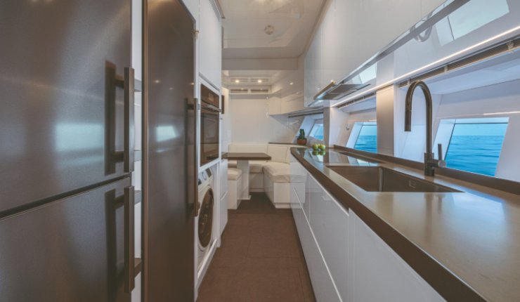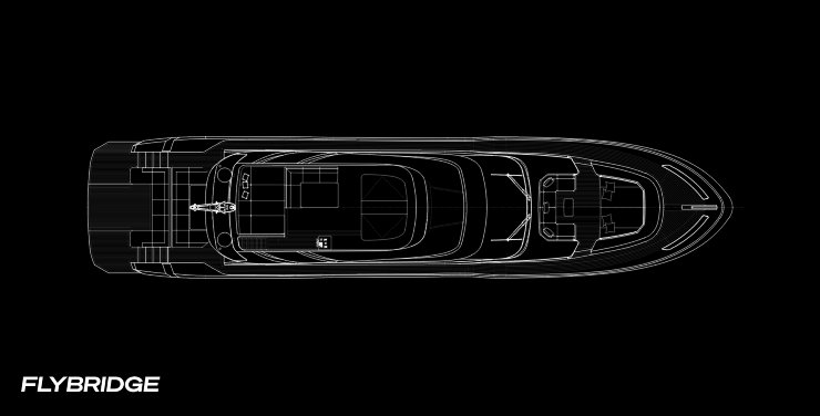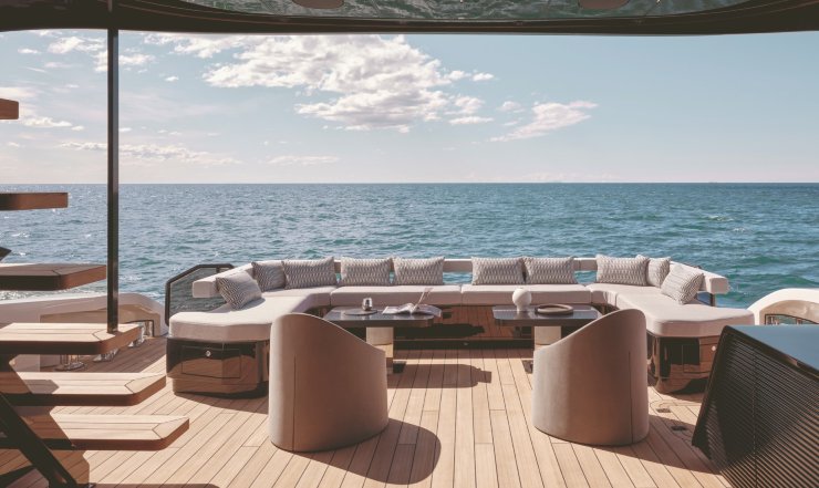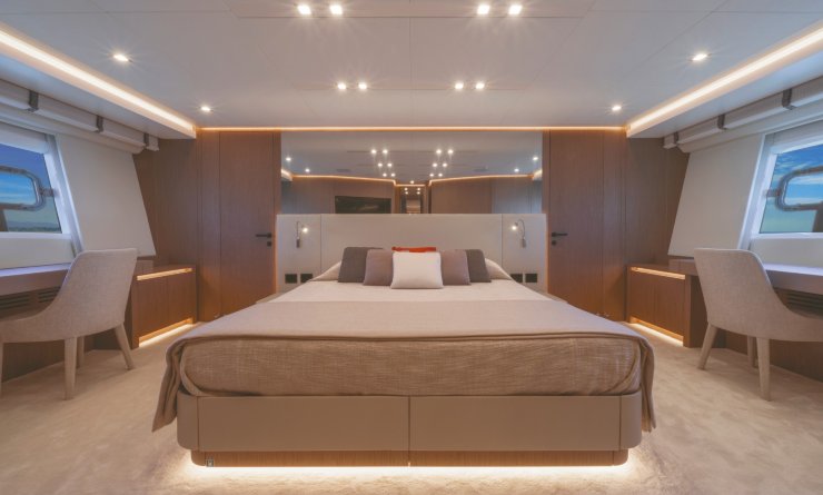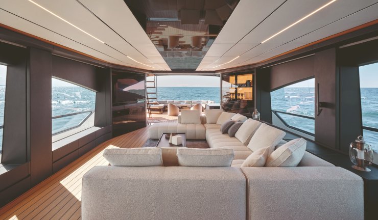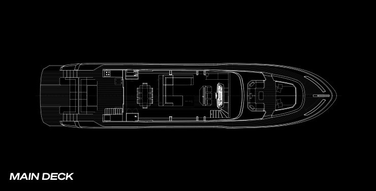 Lo sviluppo degli interni risponde a un criterio cardine: massimizzare la fruizione degli spazi mantenendo la coerenza con la natura sportiva dell’oggetto. Il main deck è un continuum visivo tra area living, zona dining e apertura verso la spiaggetta di poppa; le vetrate filanti e i montanti snelli alleggeriscono il perimetro, amplificando la luminosità senza compromettere la rigidezza. Le soluzioni “galley up/down” permettono di modulare l’uso privato/charter, mentre sottocoperta la tipica distribuzione prevede una cabina armatoriale a tutto baglio, una VIP e due ospiti, con percorsi di servizio separati per l’equipaggio.
