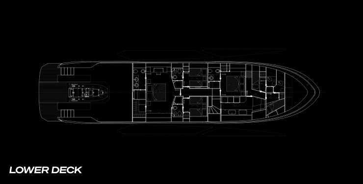 La zona equipaggio è separata con percorsi di servizio che consentono di operare senza interferire con la vita degli ospiti. La cucina, le aree di stivaggio e i locali tecnici sono posizionati per minimizzare i tempi di spostamento e massimizzare la sicurezza nelle manovre. La sala macchine, punto critico su qualsiasi barca veloce, è organizzata con grande attenzione ad accessibilità e ventilazione: i flussi d’aria forzata seguono percorsi razionali che evitano ristagni e cali di efficienza dei gruppi.