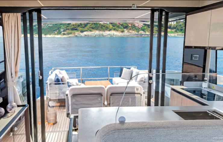 Il tratto più distintivo è la continuità funzionale da piattaforma bagno a salone: il pozzetto modulare, con arredi mobili e sedute riconfigurabili, prolunga il living esterno; le grandi porte scorrevoli consentono la fusione degli ambienti “indoor–outdoor”. La cucina, collocata verso poppa, funge da cerniera operativa tra i due contesti: L–galley con top generosi, grande lavello, piano cottura ed elettrodomestici a incasso. Il risultato è un percorso lineare privo di strettoie in cui chi sta ai fuochi, chi serve e chi si rilassa hanno traiettorie non conflittuali.