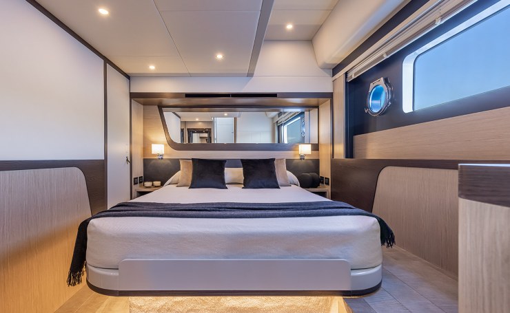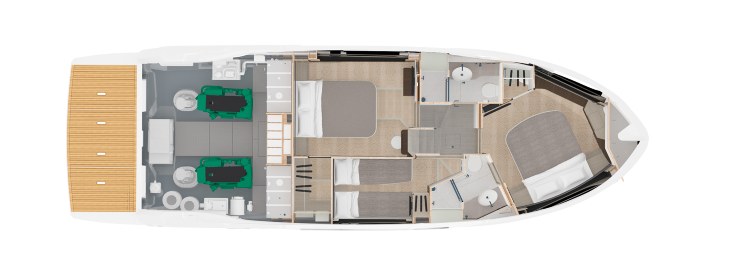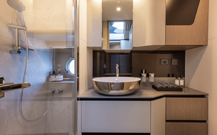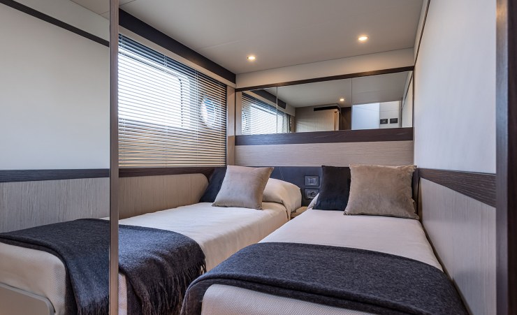 Il lower deck propone tipicamente una cabina armatoriale a centro barca con bagno en suite, una VIP a prua di taglio quasi simmetrico con letto matrimoniale e una cabina ospiti laterale, in genere con letti gemelli trasformabili. Le altezze interne sono generose, gli oblò in murata garantiscono luce e ventilazione; porte scorrevoli (“pocket doors”) ottimizzano l’ingombro nei sotto–passaggi. Le finiture privilegiano tessuti tecnici e legni chiari, con un linguaggio contemporaneo italiano che evita cromie urlate a favore di palette calde e materiali tattili.