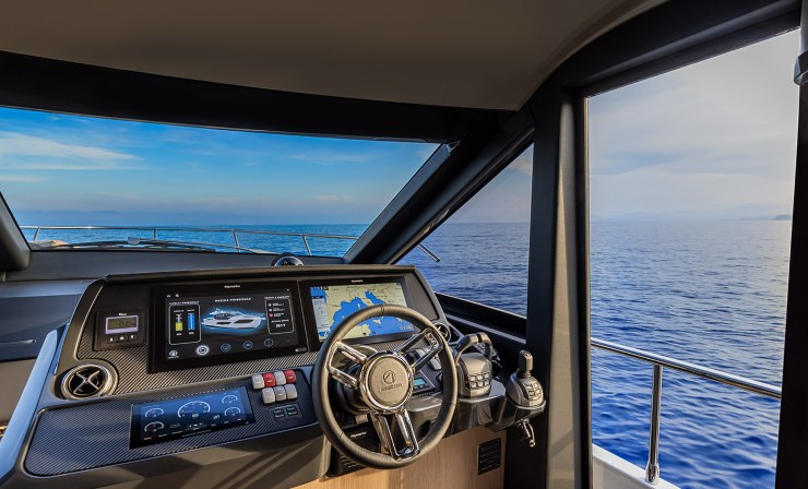 Le unità D6 con common rail ad alta pressione e turbocompressore a geometria ottimizzata lavorano con pod orientabili mulinellati a eliche controrotanti. Il sistema IPS riduce angoli di barra al minimo necessario, converte in spinta diretta la potenza disponibile e migliora l’agilità in manovra. La trasmissione su pod abbassa il baricentro, libera volumi in sala macchine e riduce la rumorosità percepita in salone. La plancia benefica della joystick integration con modalità di Assisted Docking e Dynamic Positioning in opzione, soluzioni che consentono all’armatore di gestire l’ormeggio in autonomia anche in condizioni di vento traverso.