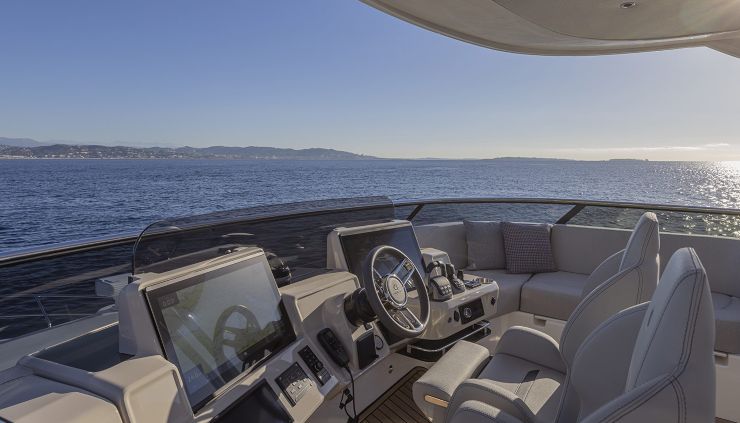Absolute Navetta 75 offre una doppia stazione di governo (interna sul main deck e sul flybridge), affiancata da un’ulteriore postazione di manovra in cockpit, pensata per facilitare gli ormeggi di poppa tipici dei porti mediterranei.