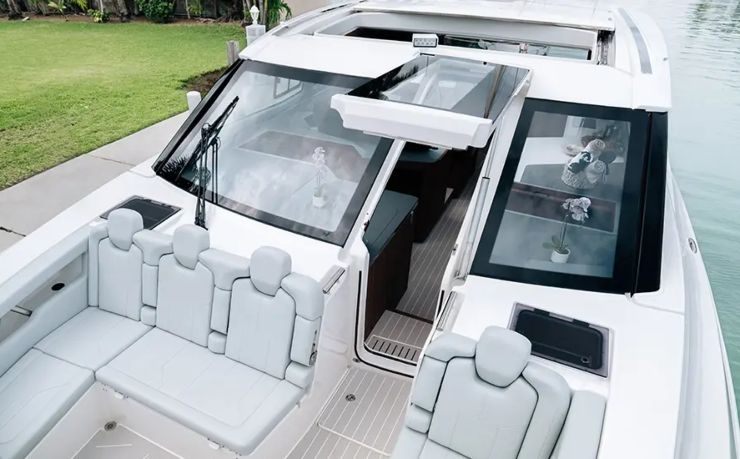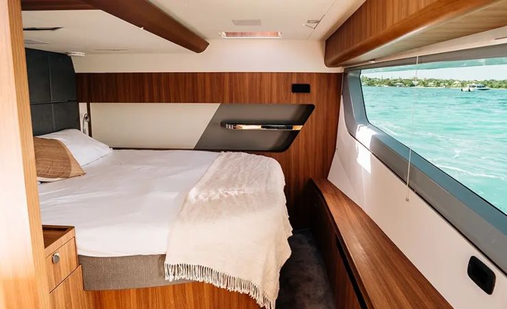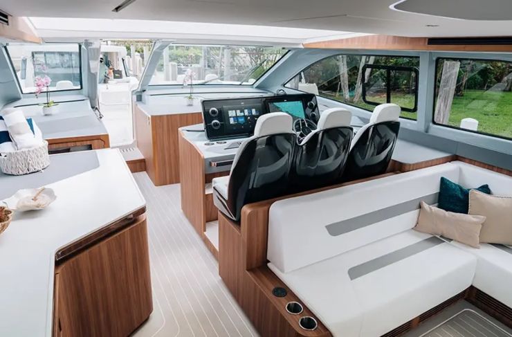 La plancia adotta logiche glass-cockpit con due MFD di grande formato (fino a 22”), integrazione del sistema C-Zone per il controllo carichi e una distribuzione comandi che privilegia la leggibilità e la ridondanza. Pilota automatico, gestione luci, pompe e climatizzazione confluiscono nel network digitale, con stato impianti e allarmi sempre disponibili. Il pacchetto energia prevede generatore dedicato per gli assorbimenti hotel e quadri AC/DC con cablaggi etichettati e percorsi accessibili. Sistemi ausiliari come telecamere di ormeggio, spotlight regolabile, verricello d’ancora e joystick integrati completano l’equipaggiamento.