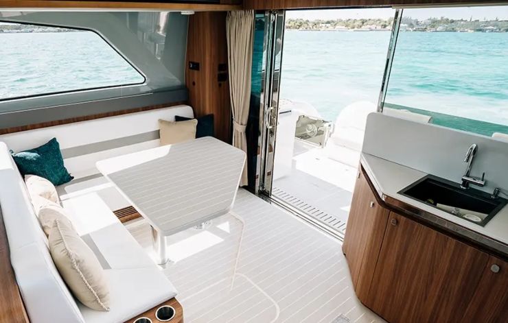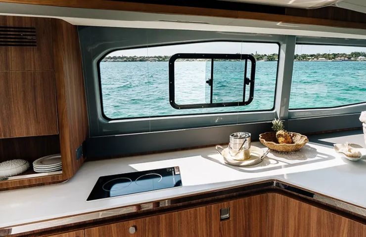 Il 46 Coupe privilegia la continuità tra interno ed esterno: dal pozzetto si accede a un salone su un unico livello con grande vetrata basculante che crea un piano bar verso poppa. La cucina, completa di piano a induzione e refrigerazione sotto top, è a ridosso dell’aperto per facilitare il servizio verso l’esterno. A dritta si sviluppa una dinette modulare: il tavolo a movimento verticale consente configurazioni dining, coffee table o flush floor per liberare l’area. La comunicazione con la prua avviene mediante varco centrale, in modo che la lounge prodiera, protetta da murate alte, resti fruibile anche in trasferimento. La suite armatoriale occupa buona parte di uno scafo con bagno e doccia separati; gli ospiti dispongono dell’altro scafo con cabina e servizi indipendenti. Ampie superfici vetrate in murata riducono la sensazione di “tunnel” tipica dei cat e alimentano luce naturale.