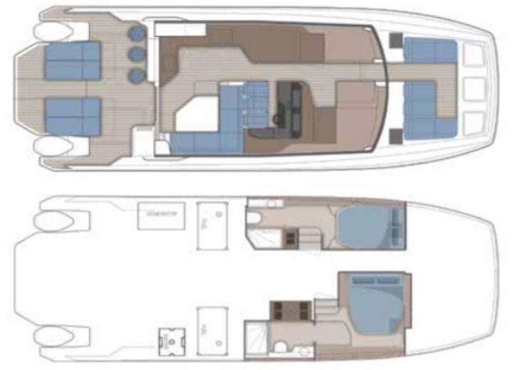 - Layout: 2 cabine/2 bagni, salone su un livello, passaggio centrale a prua, pozzetto bar