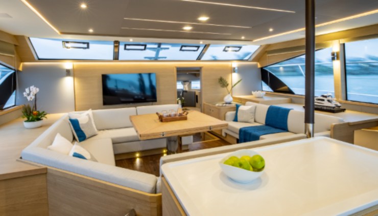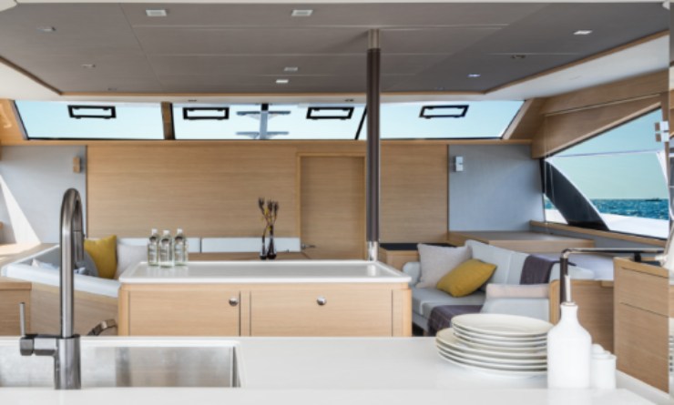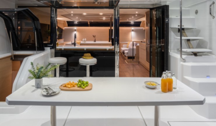 Il linguaggio stilistico dell’Aquila 54 privilegia superfici tese, vetrate a sviluppo verticale e un flybridge che “copre” il pozzetto, generando un’ampia zona d’ombra. Il salone principale è impostato come uno spazio continuo con cucina “galley-up” o, in alternativa, con cucina “galley-down” in uno dei due scafi, scelta che libera superficie sul ponte principale per una dinette più generosa.