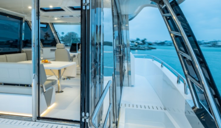 • Flybridge: in versione aperta con arredi esterni oppure chiuso e climatizzato (SkyLounge) con seconda timoneria