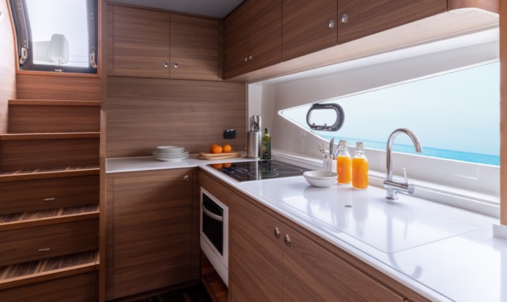 L’abitabilità è uno dei punti forti dell’Aquila 54. Il salone beneficia di superfici vetrate a tutta altezza, con luce naturale diffusa e un rapporto interno/esterno continuo grazie all’apertura scorrevole verso il pozzetto. La cucina, che può ospitare frigoriferi “full size”, piano cottura a induzione e ampie superfici di lavoro, consente una gestione reale della cambusa per crociere prolungate.