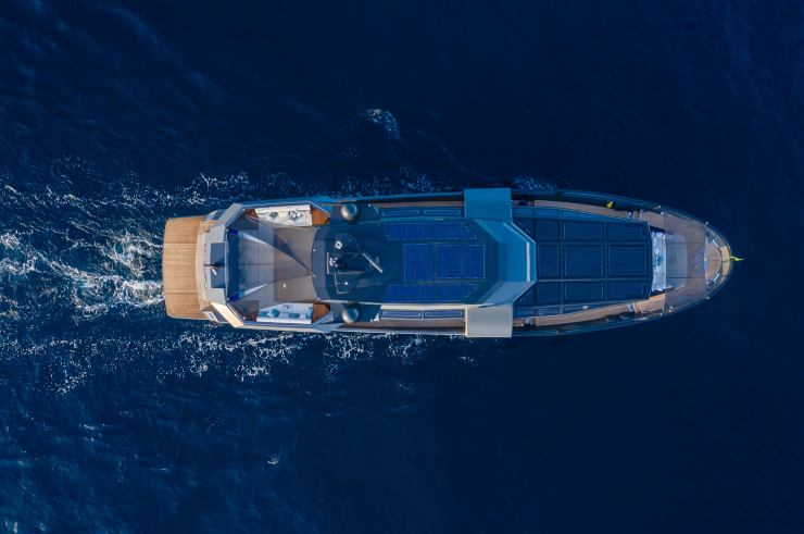 L’approccio ibrido GRP + alluminio con vetrature di grande estensione è un marchio di fabbrica Arcadia: riduce masse nella parte alta, abbassa il vertical center of gravity e consente ampia luce naturale senza penalizzare la stabilità. L’integrazione dei pannelli solari sul tetto della sovrastruttura fornisce energia ausiliaria per utenze di bordo, contribuendo a ridurre generatori in rada.