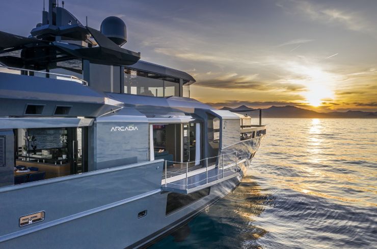 - Benetti Oasis 34M: beach terrace e vita di poppa; Arcadia duplica l’idea di veranda protesa al mare con un linguaggio stilistico più “razionalista”.
