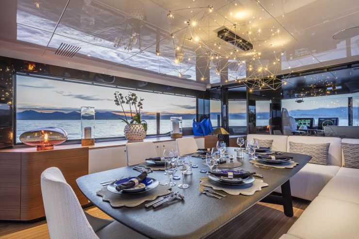 Open space con salone e dining collegati al pozzetto; porte scorrevoli a tutta altezza e terrazze apribili; verso prua possibilità di studio o quinta cabina. Continuum visivo mare–interno.