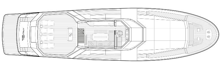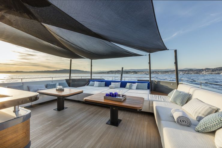 Sky lounge convertibile che si apre sull’octagonal sun lounge poppiero (~65 m²), soluzione ideale per ospitalità e intrattenimento in rada.
