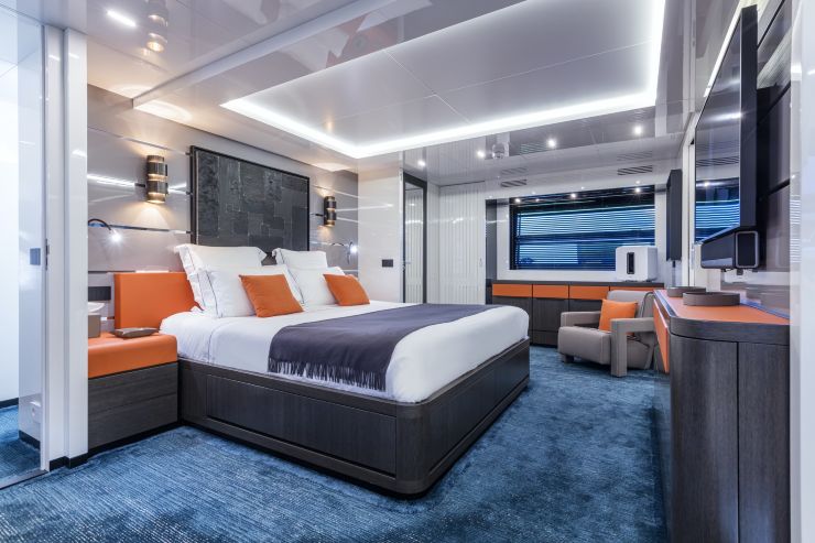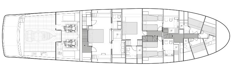 Fino a 4–5 cabine ospiti tutte con bagno; crew area fino a 6 posti con percorsi separati; accesso alla sala macchine facilitato per manutenzione on condition.