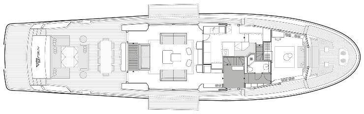 Il tratto stilistico dell’A105 è pulito e funzionalista: linee tese, sovrastruttura leggera con vetrate continue, volumi che dichiarano la vocazione conviviale. Il main deck scorre in open space verso poppa; il bow lounge può ospitare playroom, quinta cabina o uno studio privato, mentre lo upper deck alterna aree chiuse e semi-aperte con il già citato sky lounge convertibile.