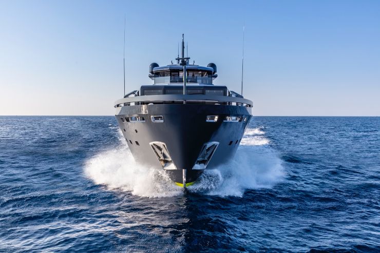 La carena semi-dislocante privilegia stabilità e autonomia a velocità di crociera medio-alte per la categoria, con sezioni poppiere adatte a sostenere la spinta alle andature intorno ai 15–17 nodi e un piano di prua che favorisce comfort sull’onda corta mediterranea. Il rapporto LOA/Beam restituisce volumi importanti su main e upper deck, mentre l’opera morta bassa e il baricentro contenuto limitano il beccheggio. Stabilizzatori “at anchor” aumentano la fruibilità delle aree esterne in rada.