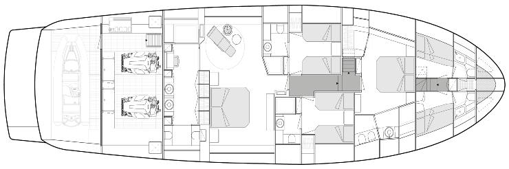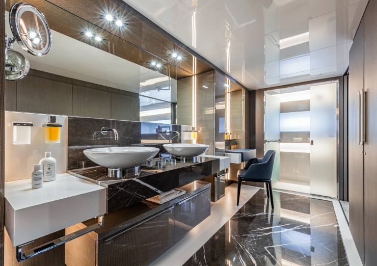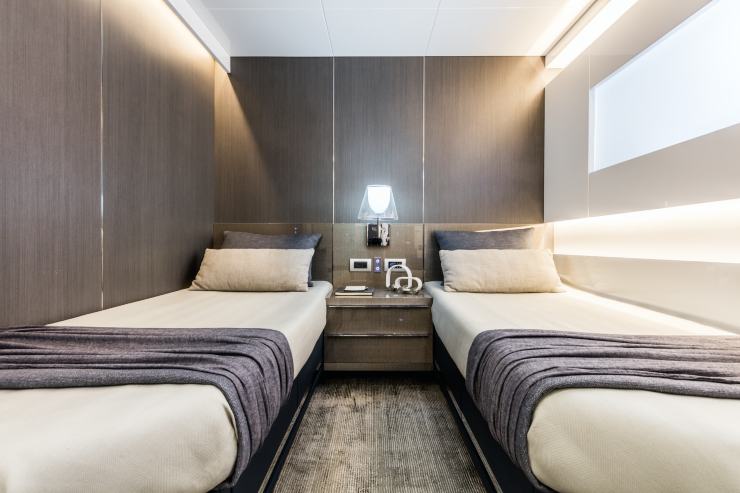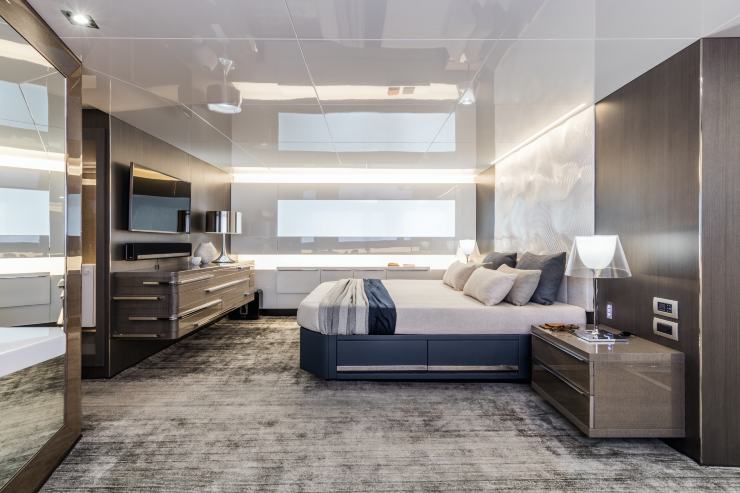 Sottocoperta, il layout standard prevede 4 cabine per 8 ospiti: una spaziosissima suite armatoriale full-beam a centro barca, una VIP a prua e due cabine ospiti (con letti singoli o matrimoniali a seconda delle richieste). La master cabin, con oltre 32 m² di superficie, è oggi una delle più generose nella categoria, con grandi finestrature laterali, zona lounge, armadiature a tutta altezza e un bagno en-suite di dimensioni quasi “residenziali”.