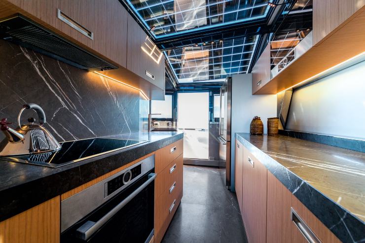 I pannelli solari dell’A85, integrati nella sovrastruttura e nel tetto, coprono una superficie di oltre 40 m² e possono generare fino a 4,5–5,5 kW di potenza, sufficiente per alimentare buona parte dei carichi di bordo non propulsivi in condizioni di irraggiamento ottimale. Questo consente, in rada, di limitare sensibilmente l’uso dei generatori, con vantaggi in termini di consumi, emissioni e comfort acustico.