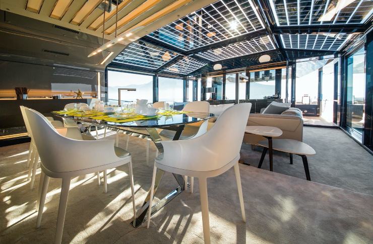 La sovrastruttura è in alluminio, un materiale leggero che contribuisce ad abbassare il baricentro dell’imbarcazione migliorandone la stabilità globale. Le superfici vetrate a tutta altezza sono realizzate con doppio vetro termoisolante, studiato per ridurre i carichi termici interni e, di conseguenza, l’utilizzo dell’aria condizionata. L’integrazione strutturale dei pannelli fotovoltaici nel tetto e nelle vetrate superiori rappresenta uno degli elementi più caratteristici dell’A85.