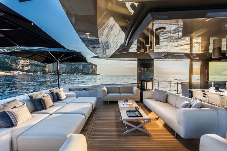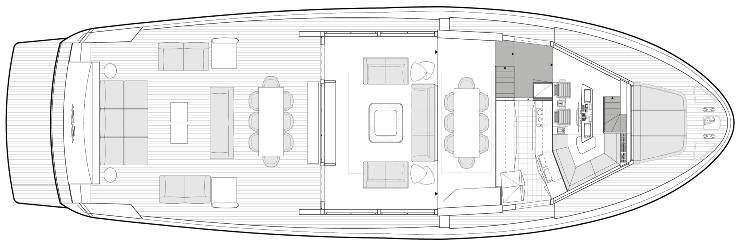 Il ponte principale è il cuore concettuale dell’A85. Dall’ampio pozzetto di poppa, che si sviluppa come un patio sul mare di circa 100 m², si entra in un salone completamente vetrato con pavimento su un unico livello fino alla zona prodiera. L’effetto è quello di un grande open space, con zona pranzo, area lounge e, a seconda delle configurazioni, galley “open” o semi-nascosta.