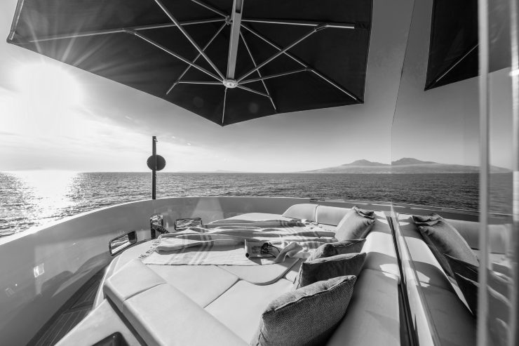 Gli spazi esterni rappresentano uno dei punti di forza dell’A85. A poppa, il pozzetto si sviluppa su tutta la larghezza, con un grande tavolo pranzo, divani a C e aree relax modulabili. La spiaggetta di poppa è spesso dotata di piattaforma idraulica per varo/alaggio del tender e per ampliare la superficie a contatto con l’acqua. A prua, un’area lounge con prendisole e dinette trasformabile permette di sfruttare in modo raffinato anche la zona normalmente più sacrificata a bordo.