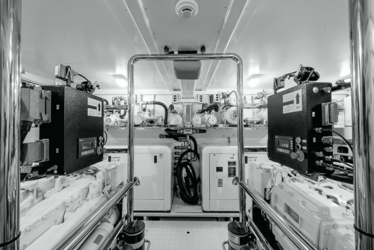 Sottocoperta, la sala macchine ospita una coppia di MAN I6 da 800 hp ciascuno, in linea d’asse con eliche a passo fisso attentamente calcolato per ottimizzare la resa alle velocità di crociera. È una configurazione “classica” per yacht di questa dimensione, ma qui abbinata a una carena meno energivora rispetto a molti concorrenti, con evidenti vantaggi su consumi, autonomia e rumorosità di esercizio.