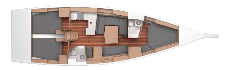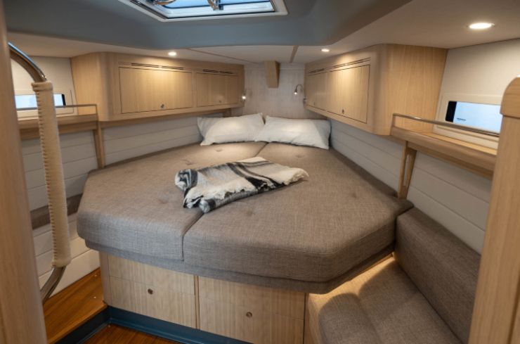 Sotto coperta, la 435 Mk II gioca una carta importante: non si limita a “mettere un salone”, ma costruisce una vivibilità coerente con la navigazione. Le sedute sono dimensionate anche per fungere da cuccette di mare, l’illuminazione è pensata per l’uso quotidiano, e la ventilazione è curata con aperture che migliorano la qualità della vita a bordo, specialmente in estate. La Mk II beneficia inoltre dell’incremento di altezza interno, rendendo più credibili le cabine alle estremità, dove spesso i performance cruiser soffrono maggiormente.