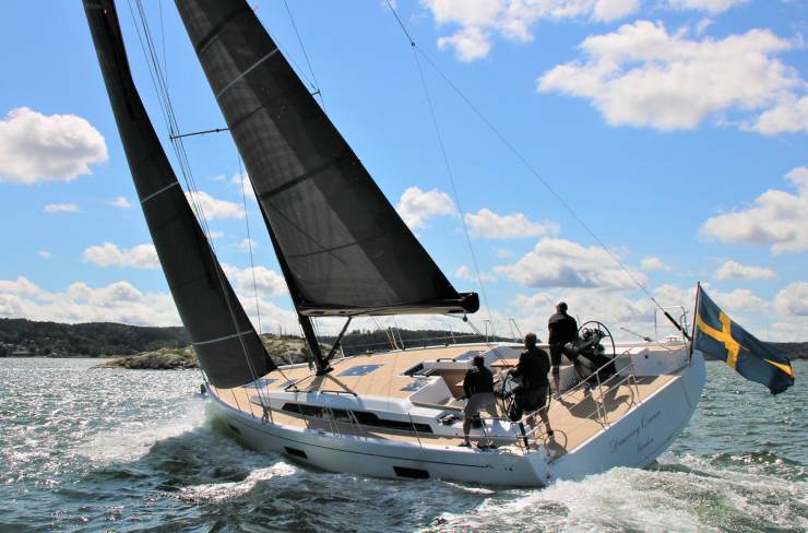 Il 50 piedi svedese è stato progettato per muoversi con aria leggera e restare composto quando le cose si fanno più serie. In bolina, con 10–12 nodi veri e genoa, si ottengono angoli stretti e velocità stabili nell’intorno dei 7–8 nodi; con asimmetrici o Code 0 alle portanti la barca allunga con progressione fluida, mantenendosi piatta grazie al momento raddrizzante. A motore, l’elica e il rapporto di riduzione sono dimensionati per trasferimenti efficienti: la velocità di crociera meccanica è coerente con il segmento, con consumi allineati a un dislocamento contenuto e serbatoi dimensionati per tratte di più giorni senza rifornimento.