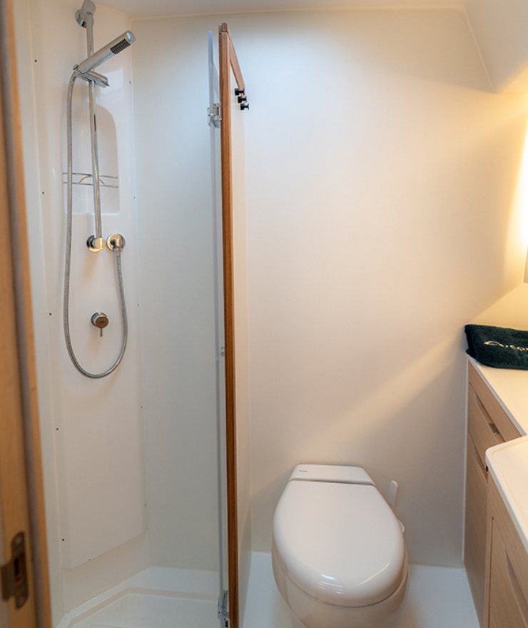L’elettronica è impostata su strumenti vento, log, GPS e autopilota integrati da un plotter principale posizionato in modo da essere leggibile sia al tavolo carteggio sia in pozzetto. L’illuminazione è interamente a LED con circuiti dimmerabili; i quadri elettrici sono ordinati, etichettati e assistiti da canaline cablate in modo che ogni linea sia individuabile. La predisposizione per desalinizzatore, generatore e clima è prevista senza andare a disturbare baricentro e accessibilità. Anche la parte idraulica è tratta come un “sistema”: passaggi regolari, filtri e valvole raggiungibili, pompe su supporti anti-vibrazione.