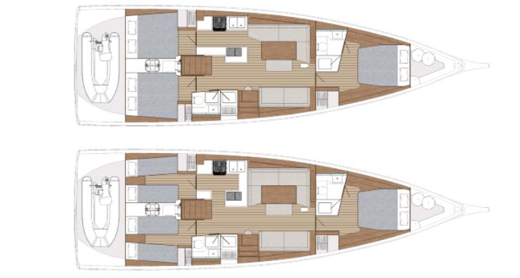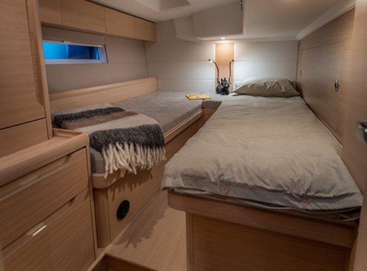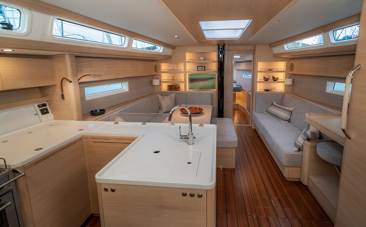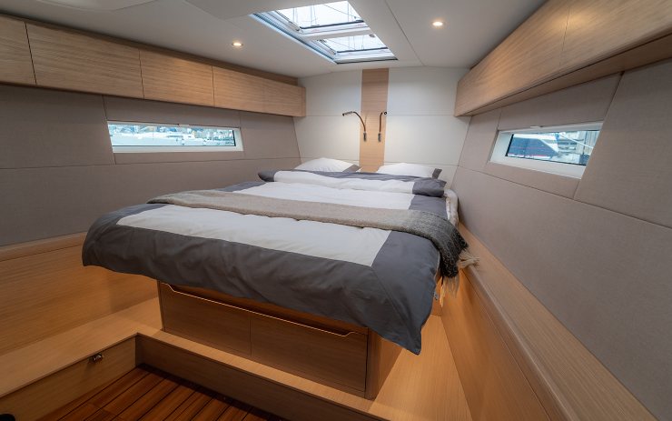 La pianta interna è a tre cabine e due bagni con docce separate. La cabina armatoriale di prua ha letto passante e spazi di stivaggio distribuiti su livelli, pensati per separare l’equipaggiamento di lungo raggio dall’uso quotidiano. In dinette, la geometria a “L” del divano principale e le superfici verticali chiare amplificano la luce; il carteggio rimane un ambiente vero, con seduta ergonomica, piani di lavoro e spazio per strumenti aggiuntivi. La cucina può essere parallela o a “U”: nella prima configurazione aumenta il passaggio longitudinale, nella seconda cresce la superficie utile per preparazioni in navigazione con barca sbandata. Le cabine di poppa offrono letti ampi con possibilità di configurazioni gemelle o matrimoniali, e mantengono aperture per ventilazione trasversale.