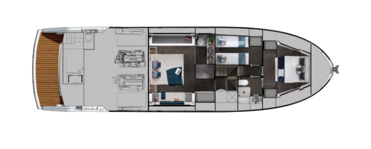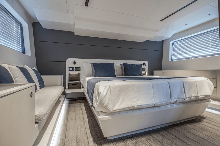 Il ponte inferiore ospita la cabina armatoriale full beam a centro barca, con grandi finestrature a murata, letto matrimoniale king size, zona vanity/ufficio e un bagno privato con box doccia separato. A prua si trova la cabina VIP, anch’essa con letto matrimoniale e bagno dedicato (o condiviso con la terza cabina, a seconda delle configurazioni), mentre a murata è presente una terza cabina ospiti con letti singoli in piano o trasformabili in matrimoniale.