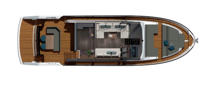 A poppa, il pozzetto ospita una grande dinette con tavolo fisso e divano a “L”, ombreggiata dal flybridge. La piattaforma bagno può essere fissa o dotata di sistema di sollevamento idraulico per varo/alaggio del tender, trasformando la zona in una vera beach area. Il collegamento tra pozzetto e salone avviene tramite una grande vetrata scorrevole, che, una volta aperta, crea un unico piano continuo interno/esterno, soluzione oggi imprescindibile su ogni yacht di questa fascia.