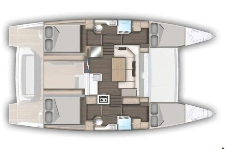 La versione armatoriale a tre cabine dedica uno scafo intero al proprietario: letto “queen”, armadiature verticali, cassetti profondi, zona vanity/desk e bagno privato con box doccia. Nello scafo opposto, due cabine ospiti di dimensioni simmetriche condividono il secondo bagno, anch’esso con doccia separata. La configurazione a quattro cabine – molto richiesta dal charter – mantiene volumi equilibrati grazie a bagni compatti e a una sapiente ingegnerizzazione degli stivaggi sotto cuccetta e ai lati delle paratie.