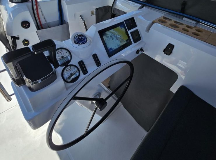 La postazione di governo è laterale, rialzata quanto basta per dare pieno controllo sull’angolo di prua e sulla randa. I comandi motore sono a portata di mano, così come i winch per cazzare o lascare senza spostarsi. La strumentazione (MFD, autopilota, vento, profondità, velocità, eventuale radar e AIS) è ben leggibile all’ombra del tettuccio. Gli specchi in poppa e i volumi della tuga sono smussati in funzione della visibilità, fondamentale nelle manovre in porto e nei passaggi stretti tra i gavitelli.
