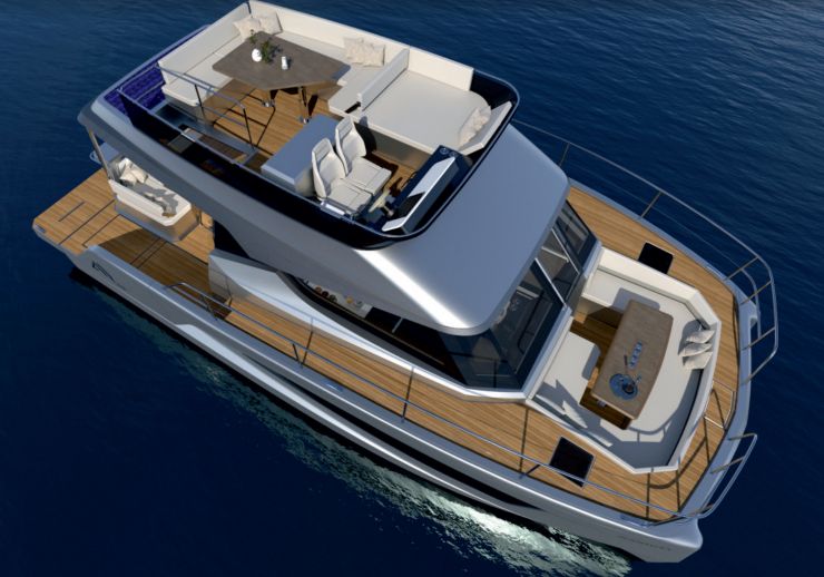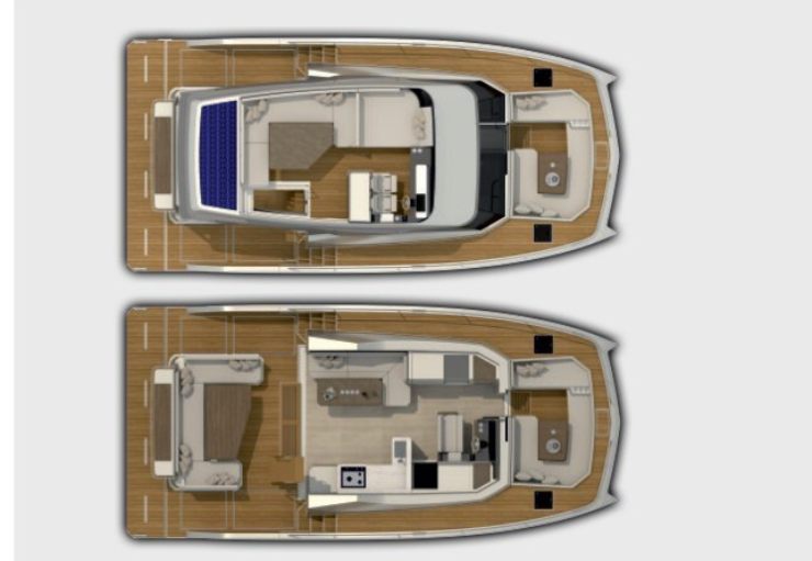 La climatizzazione multizona, le coibentazioni in sandwich e la separazione degli scafi per la zona notte si traducono in un soundscape di bordo sobrio: meno vibrazioni trasmesse e minor rumore di scarico rispetto a monoscafi di pari potenza, soprattutto a regimi di crociera. L’ergonomia del posto di guida — interno ed esterno — prevede seduta regolabile, pod strumenti su più livelli e manovre a vista.