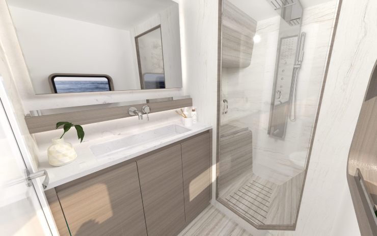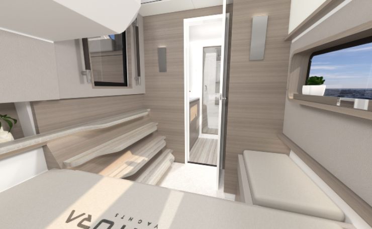 Il layout night-area prevede un owner’s hull (scafo di dritta) con cabina armatoriale che occupa quasi interamente il volume, bagno privato e doccia separata; sullo scafo di sinistra trovano posto due cabine ospiti e un secondo bagno. La privacy tra gli scafi, con corridoi dedicati e paratie fonoassorbenti, consente comfort acustico superiore a molti monoscafi equivalenti.