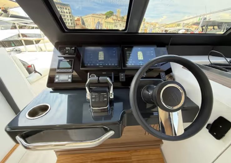 Il pacchetto elettronico tipico comprende plancia con display multifunzione in rete (NMEA 2000), autopilota, ecoscandaglio a doppia frequenza e radar a compressione d’impulso; su richiesta, lidar anti-collisione e termocamera. La domotica di bordo integra monitoraggio livelli, gestione batterie (BMS), impianto AC/DC e climatizzazione via interfaccia unica; in versione elettrica, i moduli di potenza dialogano con inverter/charger per ottimizzare i cicli di ricarica. La rete è predisposta per aggiornamenti over-the-air e diagnostica remota dei sistemi principali, con cablaggi ordinati e canaline ispezionabili su entrambi i bracci della struttura trasversale. (Valori e dotazioni possono variare per mercato e dealer).