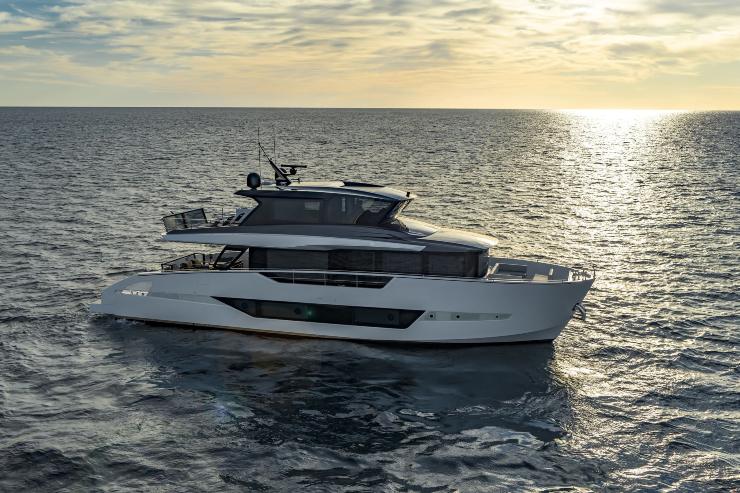 • Azimut 78/Grande 26M: stile italiano e tecnologie avanzate; AX8 offre un pacchetto stabilizzazione combinato e ampie superfici vetrate verticali.