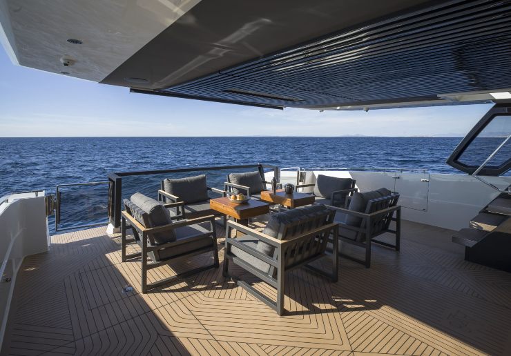 Il beach club è il cuore della vita in rada: piattaforma idraulica con portata adeguata a tender/moto d’acqua, doccia a pioggia a scomparsa, moduli wet bar, cantinetta e vani per attrezzature acqua. Murate apribili trasformano lo specchio di poppa in una terrazza sul mare. Il flybridge è configurabile con dinette a isola, cucina esterna, griglia, frigo e fabbricatore di ghiaccio; il roll-bar ospita antenne, radar e, se richiesto, pannelli solari integrati per il trickle charge dei servizi di bordo.