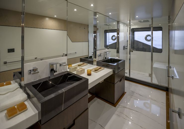 La cabina armatoriale è il manifesto dell’AX8: letto centrale king, vetrate scafo calibrate per privacy e luce, boiserie leggere che integrano pannelli fonoassorbenti, bagno con doppi lavabi, box doccia oversize e – a richiesta – vasca free-standing. Le cabine ospiti replicano la cura dei dettagli con storage capienti e bagni en suite ventilati naturalmente o con sistemi di estrazione silenziati. La climatizzazione multi-zona regola microclimi differenti per ogni ambiente attraverso fan-coil incassati e sensori di umidità.