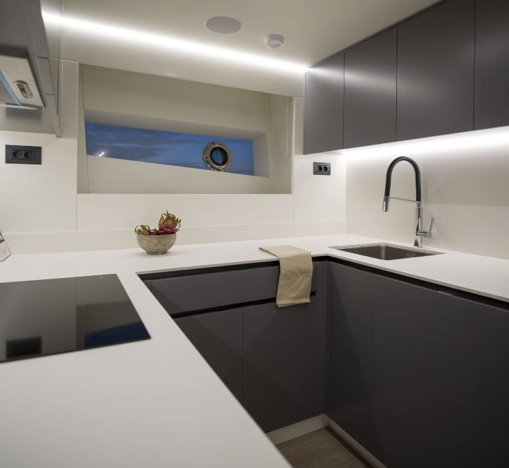 I percorsi equipaggio/ospiti sono separati; corrimani e passi in coperta rispettano altezze e distanze di sicurezza, con punti di presa frequenti e soglie antiscivolo. La cucina è un hub operativo: piani in materiali compositi resistenti al calore, celle frigo separate, dispense su guide rinforzate, elettrodomestici di fascia professionale su linee dedicate. L’illuminazione tecnica a LED integra strip dimmerabili incassate, scenari notturni e luci di cortesia a pavimento.