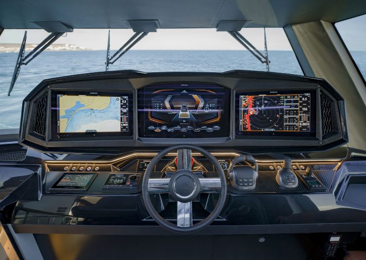 • Plancia integrata: doppi/ tripli display multifunzione in rete (radar a stato solido, cartografia vettoriale, ecoscandaglio CHIRP/3D), autopilota con interfacce NMEA, moduli AIS e doppi GPS per ridondanza.