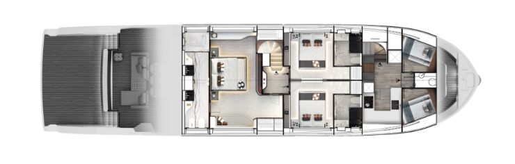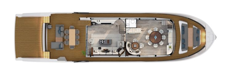 • Layout: cucina up/down, studio o media room al lower deck, cabina armatore a prua alternativa, sala gym attrezzabile.