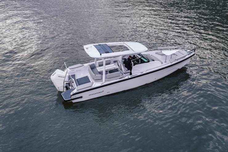 Il design dell’Axopar 29 Sun Top è evoluto in senso più angolare e contemporaneo, con un linguaggio stilistico che combina superfici tese, vetrate ben integrate e un tetto rigido che sembra sospeso sopra la zona centrale. Il risultato è una barca immediatamente riconoscibile, con una personalità forte ma priva di ridondanze estetiche superflue.