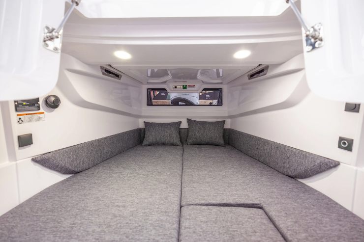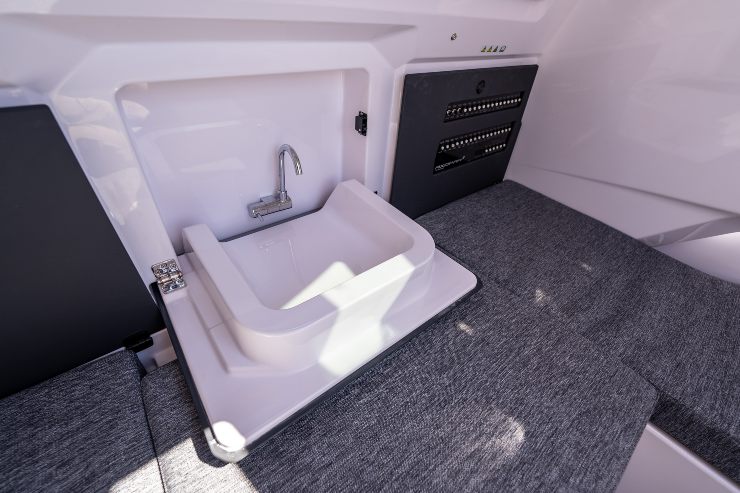 Sotto la console o nell’area dedicata, a seconda dell’allestimento, si trova una toilette separata, con wc marino, lavabo e oblò per aerazione. Pur trattandosi di un dayboat, questo ambiente permette di affrontare giornate intere in mare con un comfort che si avvicina a quello di imbarcazioni di categoria superiore. Nella versione con cabina poppiera, le possibilità di utilizzo si estendono a weekend completi e brevi crociere costiere.