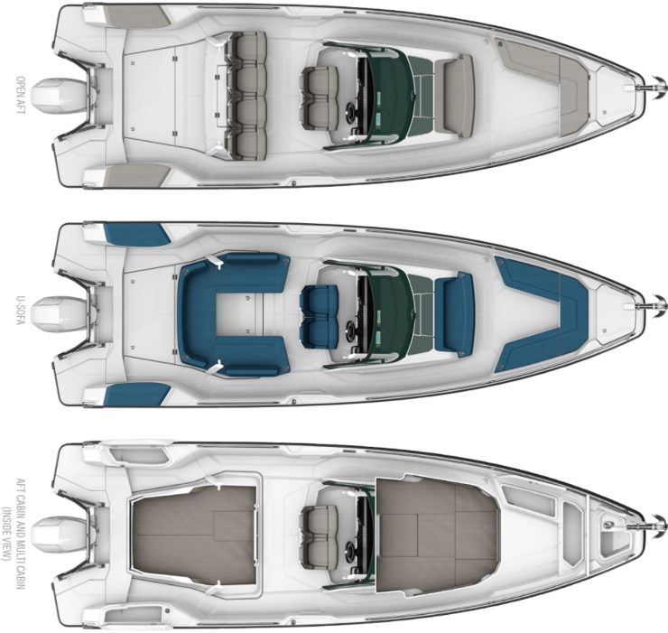 Questa modularità rende il 29 Sun Top estremamente adattabile: dalla barca “giornaliera” pura, essenziale e minimal, alla versione orientata a mini-crociere con pernottamento a bordo.